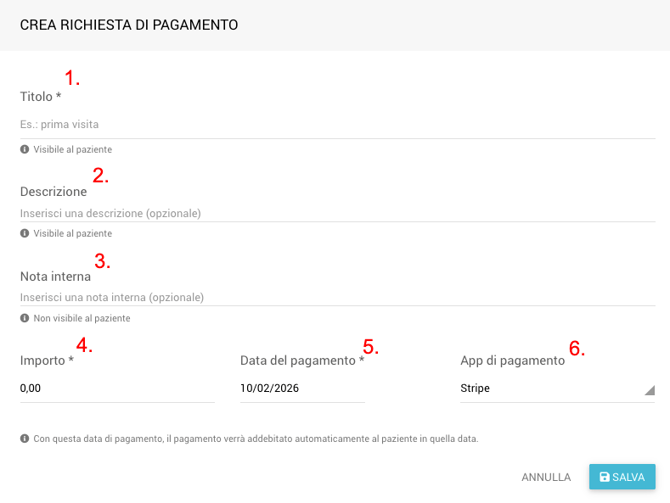 Compila la richiesta di pagamento inserendo: Titolo, Descrizione, Nota interna, Importo, Data del pagamento e l'App di Pagamento disponibile.