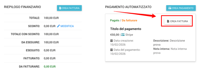 - A pagamento avvenuto, vedrete lo stato in "Pagato / Da Fatturare" ed un nuovo tasto nel riquadro del pagamento "Crea fattura"