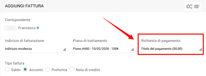 Il paziente ha pagato solo una parte del piano in anticipo (50€), ed ora si va ad emettere il saldo finale (100€). Possiamo indicare il secondo pagamento direttamente in fattura