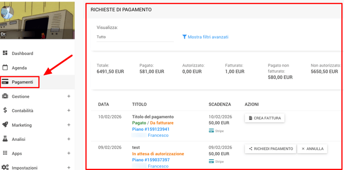 Nel menu di sinistra troverete ora una nuova voce "Pagamenti", dove potrete monitorare tutte le richieste di pagamento, il riepilogo ed utilizzare i filtri avanzati per ricerche mirate