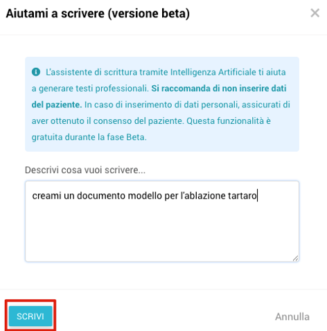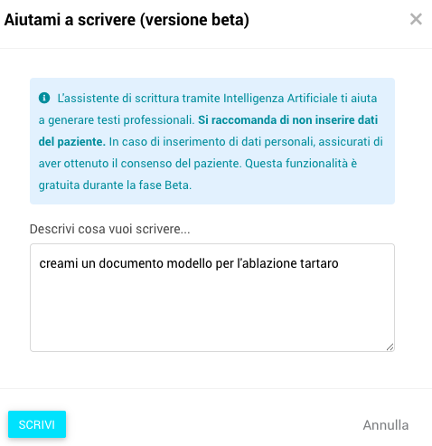 Con la funzione “Aiutami a scrivere” puoi creare testi clinici e amministrativi in modo rapido e professionale.
