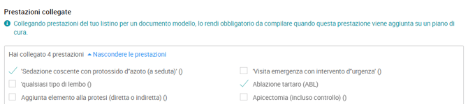 - Una volta creato il documento modello, trovate in fondo la possibilità di associarlo ad una o più prestazioni del listino: