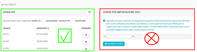 È possibile gestire l’accesso ai dati registrati su AlfaDocs da parte di altre applicazioni esterne da Impostazioni → Studio → Chiavi.