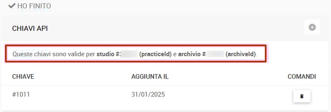 Una volta creata la prima chiave API, in alto compariranno questi due codici relativi all'ID dello studio e l'ID dell'archivio, che sono due dati che solitamente vengono richiesti per l'integrazione tramite Chiavi API: