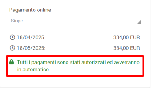 - Il sistema mostra infine se la somma tra "Già pagato" e "Pagamento online" è corretta o se mancano ancora importi scoperti da inserire in uno dei due campi
