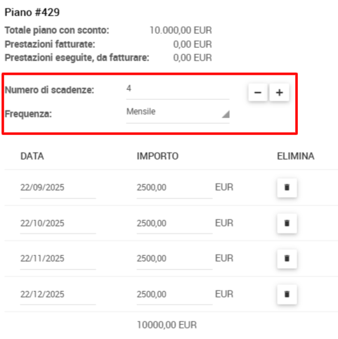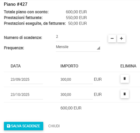 In questo modo il sistema ricalcolerà automaticamente l'ammontare di ogni scadenza in base al loro numero. Rimane sempre possibile modificare manualmente gli importi delle singole scadenze.