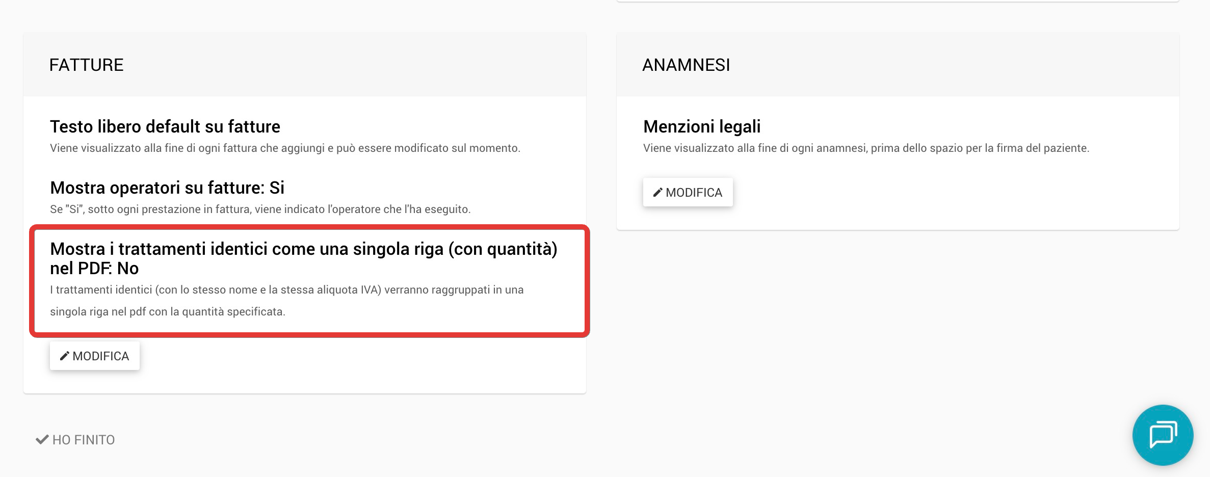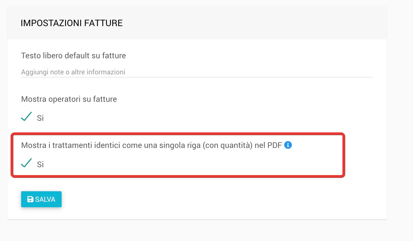 Attiva l’opzione “Mostra i trattamenti identici come una singola riga (con quantità) nel pdf”. Da questo momento il sistema potrà raggruppare automaticamente le prestazioni uguali nei nuovi documenti.