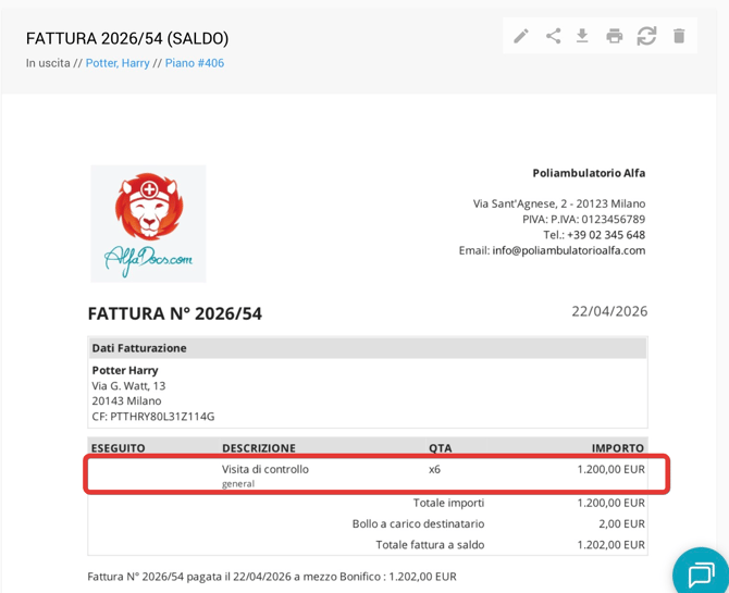 Genera o scarica il PDF. Le prestazioni identiche verranno mostrate in una sola riga, con quantità totale e importo complessivo.