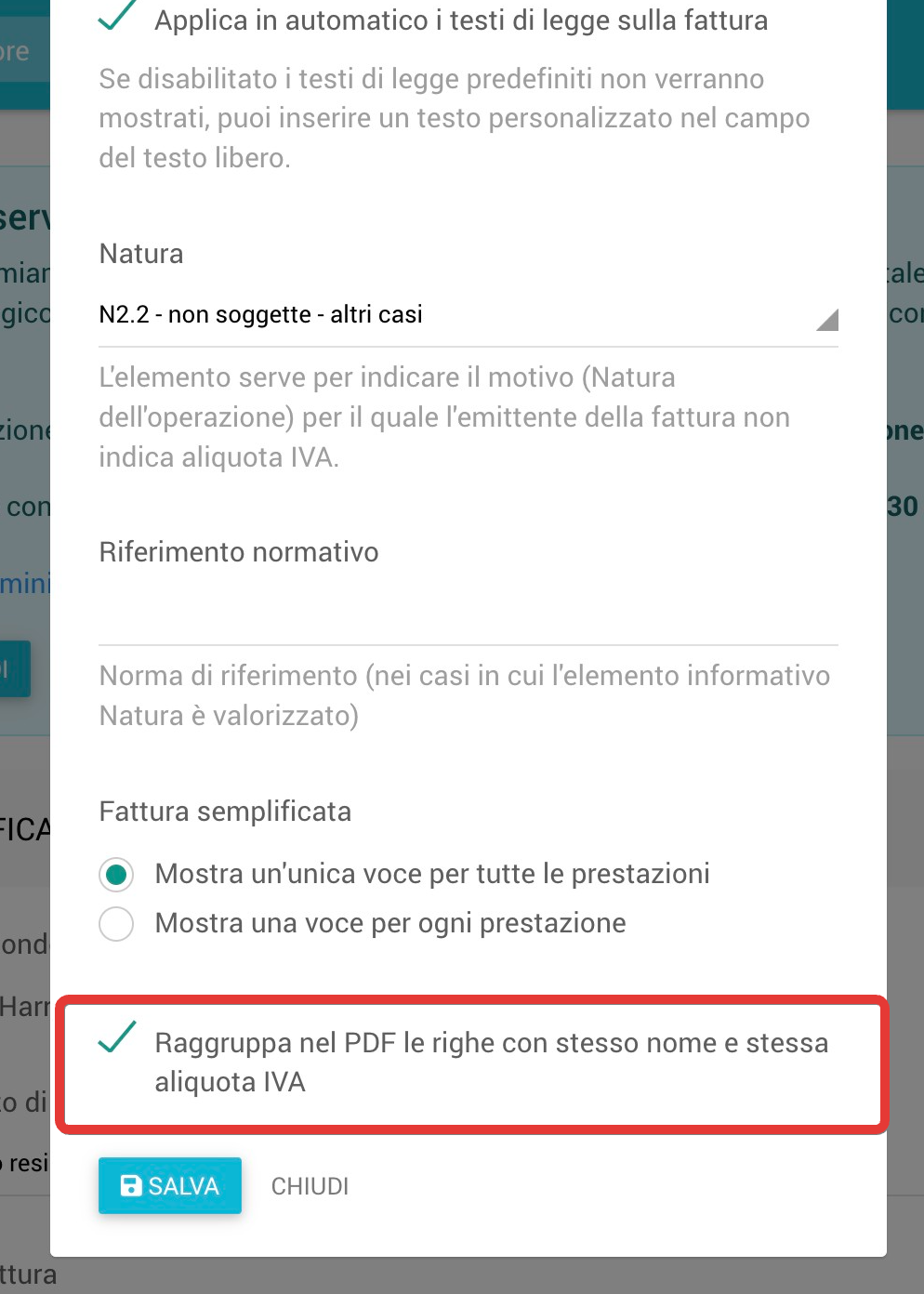 Seleziona "Raggruppa nel PDF le righe con stesso nome e stessa aliquota IVA"