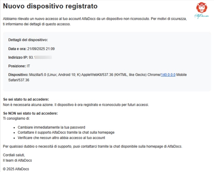 Con il nuovo sistema Sicurezza dispositivi, AlfaDocs controlla automaticamente da quali dispositivi accedi. Quando ti connetti da un nuovo dispositivo, ti verrà chiesto di confermare la tua identità tramite email.