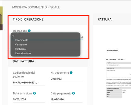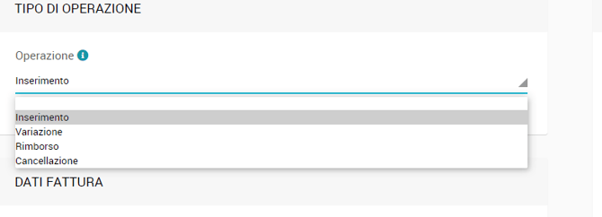 Il tipo di operazione é generalmente selezionato automaticamente dal sistema basandosi sul criterio di cassa e sugli invii precedenti delle fatture al Sistema TS, perció, preparando un nuovo pacchetto di fatture da inviare puoi notare che le fatture giá inviate e che hanno subito una correzione/aggiornamento nel tempo saranno segnalate automaticamente come Variazioni e che le note di credito saranno segnalate come Rimborsi.