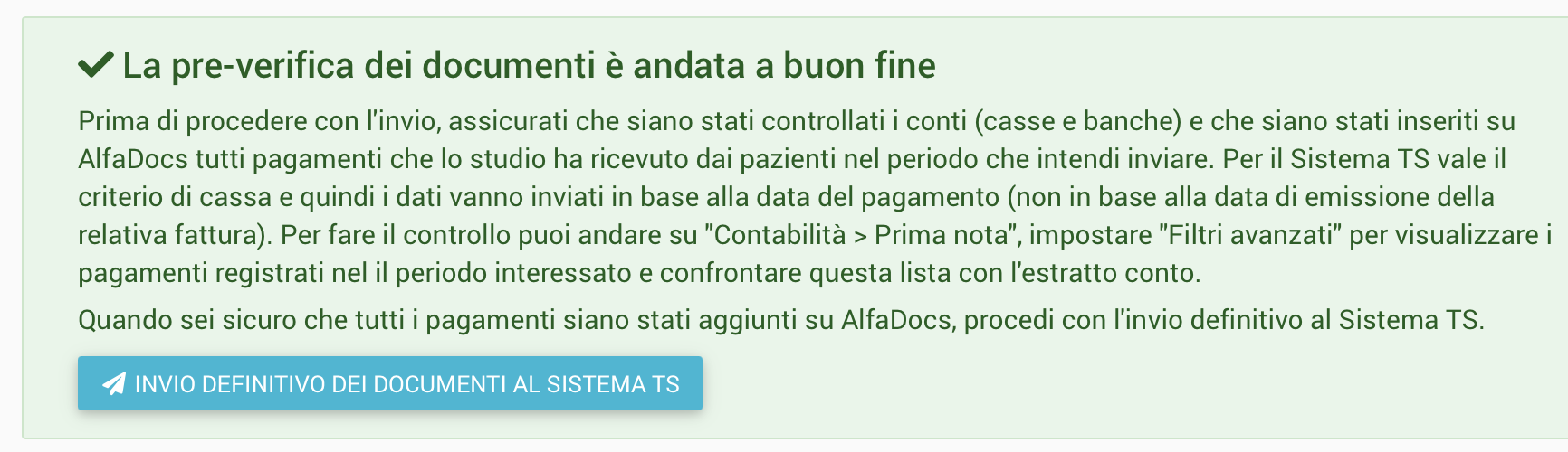 Il pacchetto di documenti fiscali é ora pronto all’invio al Sistema TS, clicca quindi INVIO DEFINITIVO DEI DOCUMENTI AL SISTEMA TS.